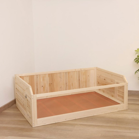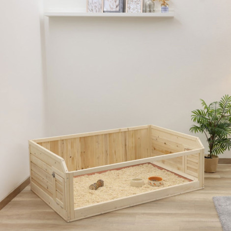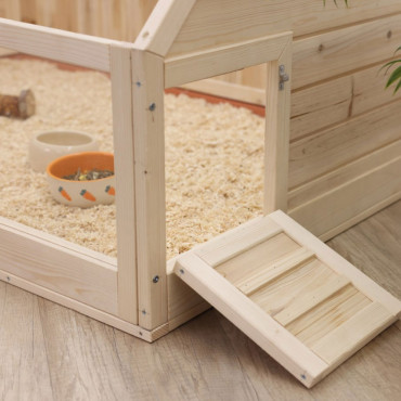 Casa interna lujosa para conejos, cobayas y otros roedores. La casa de madera natural, con ventanas panorámicas de acrílico, puede integrarse a los cómodos y ampliarse de diversas maneras, además de ser fácil de limpiar.