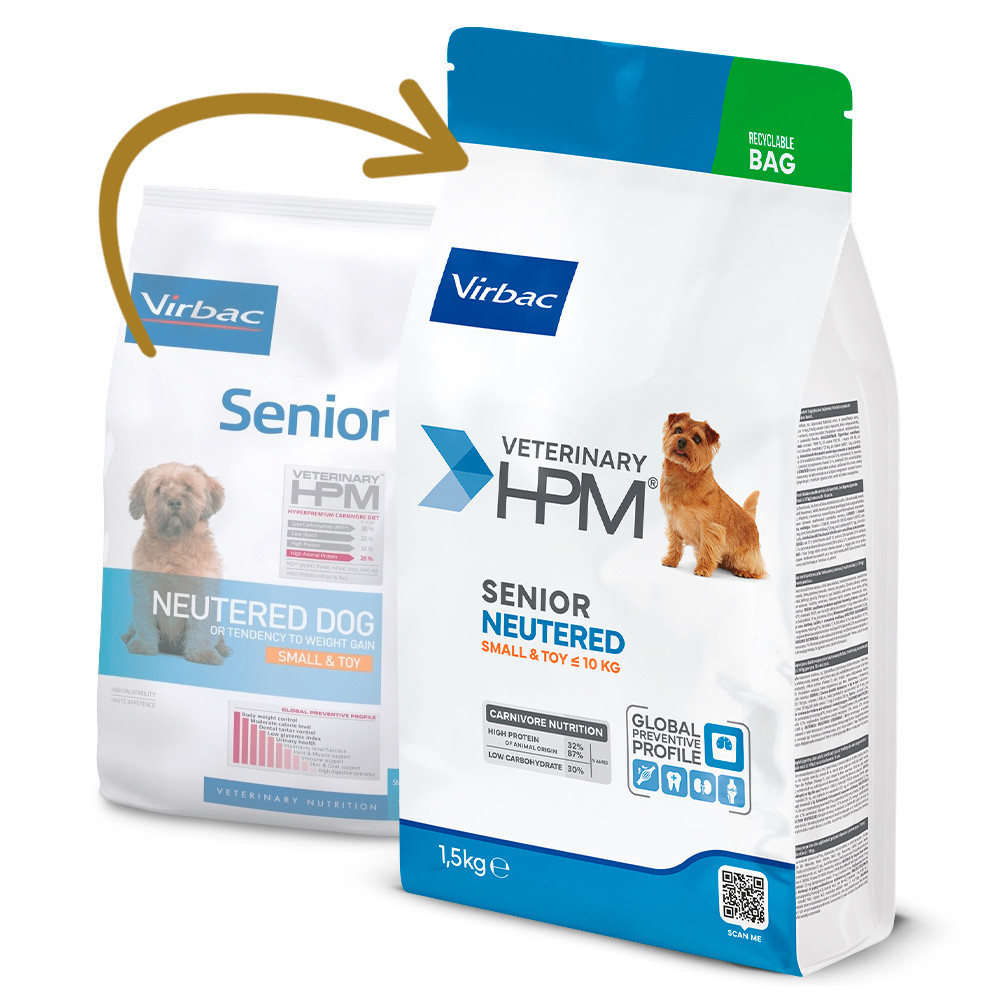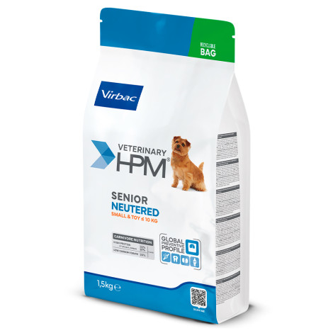 Virbac Veterinary HPM Neutered Senior dog small & toy es un alimento completo para perros senior (de más de 10 años) de raza pequeña esterilizados o con tendencia al sobrepeso. Los perros esterilizados suelen tener tendencia a aumentar de peso y apetito, y este pienso ayuda a mantener una buena condición corporal. El bajo nivel de actividad provoca predisposición a la pérdida muscular y a la rigidez articular. Este alimento contribuye a un envejecimiento saludable de tu compañero.
