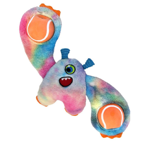 Monstruo de peluche con dos medias pelotas de plástico y un silbato para perros. Las medias pelotas parecen pelotas de tenis, pero son de plástico y emiten un fuerte silbido. El cuerpo de este peluche también cuenta con un gran silbato interno.