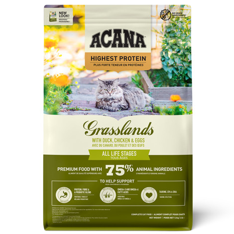 ACANA Grasslands es un pienso para gatos adultos rico en proteínas animales. Inspirado en las vastas praderas y lagos fríos del norte de Canadá, esta fórmula contiene pollo, pavo y pato, huevos de corral y pescados salvajes. Todos los ingredientes son entregados frescos o crudos a las cocinas de ACANA por productores locales. Así, puedes ofrecer a tu gato los mejores ingredientes y una receta que lo mantendrá feliz, sano y fuerte.