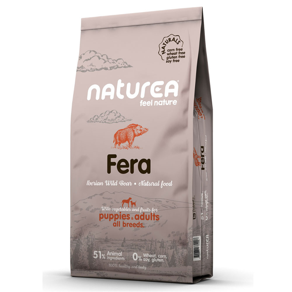 Naturea Naturals Fera Wild Boar es un alimento seco completo para perros adultos de todas las razas, cuyo ingrediente principal es la carne fresca y deshuesada de jabalí. Es un alimento natural con una fórmula similar a la dieta que los perros encontrarían en la naturaleza.