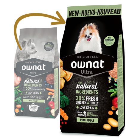 Ownat Ultra Mini Adult es un alimento seco para perros adultos de tamaño pequeño, con mayores necesidades energéticas y mayor propensión al sobrepeso. La composición del alimento ayuda al control del peso ideal, con una cantidad reducida de grasas, manteniendo una alta proporción de proteínas para garantizar una buena condición física.